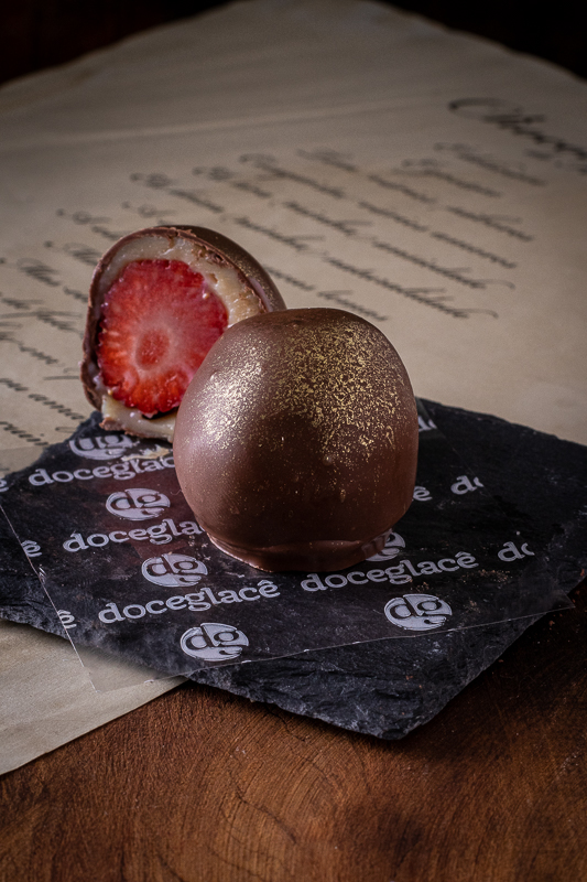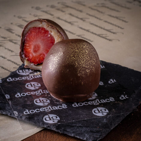 Brigadeiro branco, morango, glaçado no chocolate preto