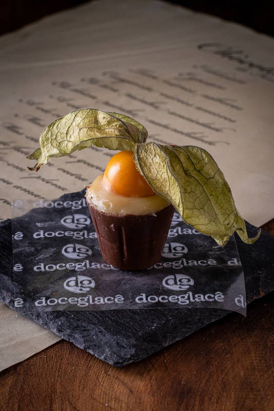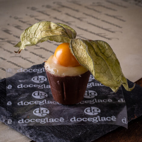 Copinho de chocolate ao leite, brigadeiro branco e physalys