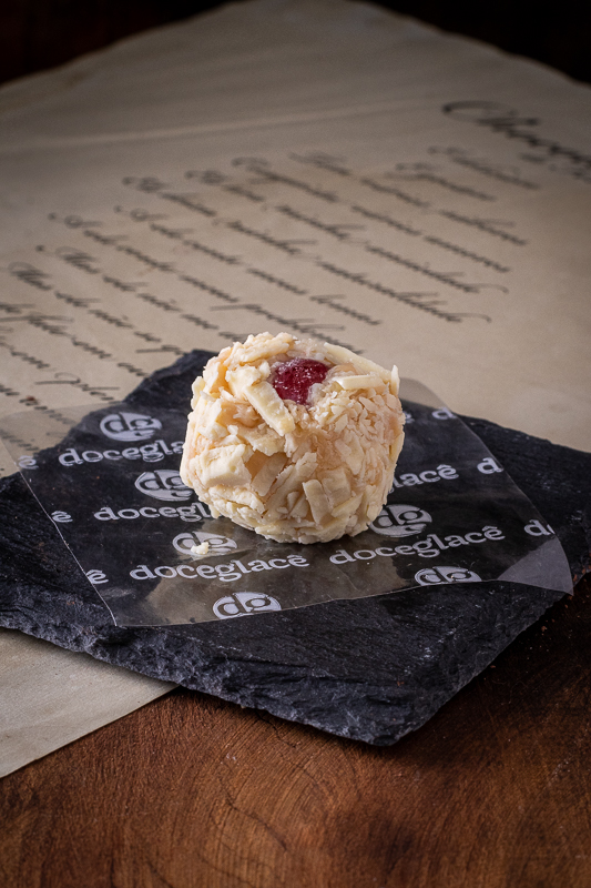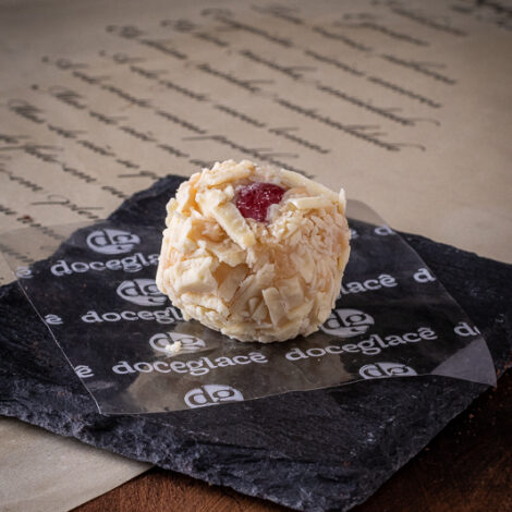 Brigadeiro branco,  cereja, raspas de chocolate branco