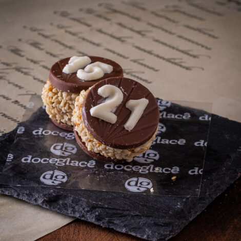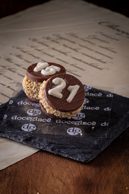Brigadeiro branco, castanha triturada, base e número de chocolate ao leite