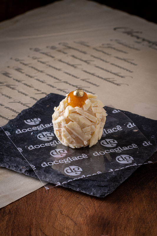 Brigadeiro branco, damasco, raspas de chocolate branco, geleia de damasco