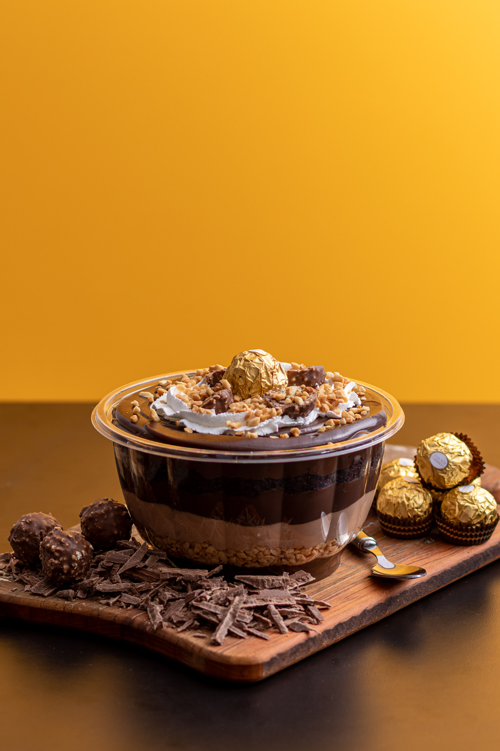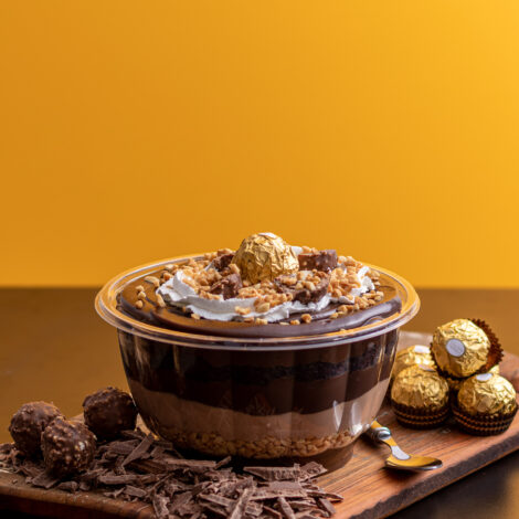 – Serve ate 8 pessoas Maravilhosa combinação de sabores: – Amendoim – Brigadeiro belga – Mousse chocolate ao leite – Pedaços de brownie – Ganache de Nutella – Chantily -Ferrero rocher