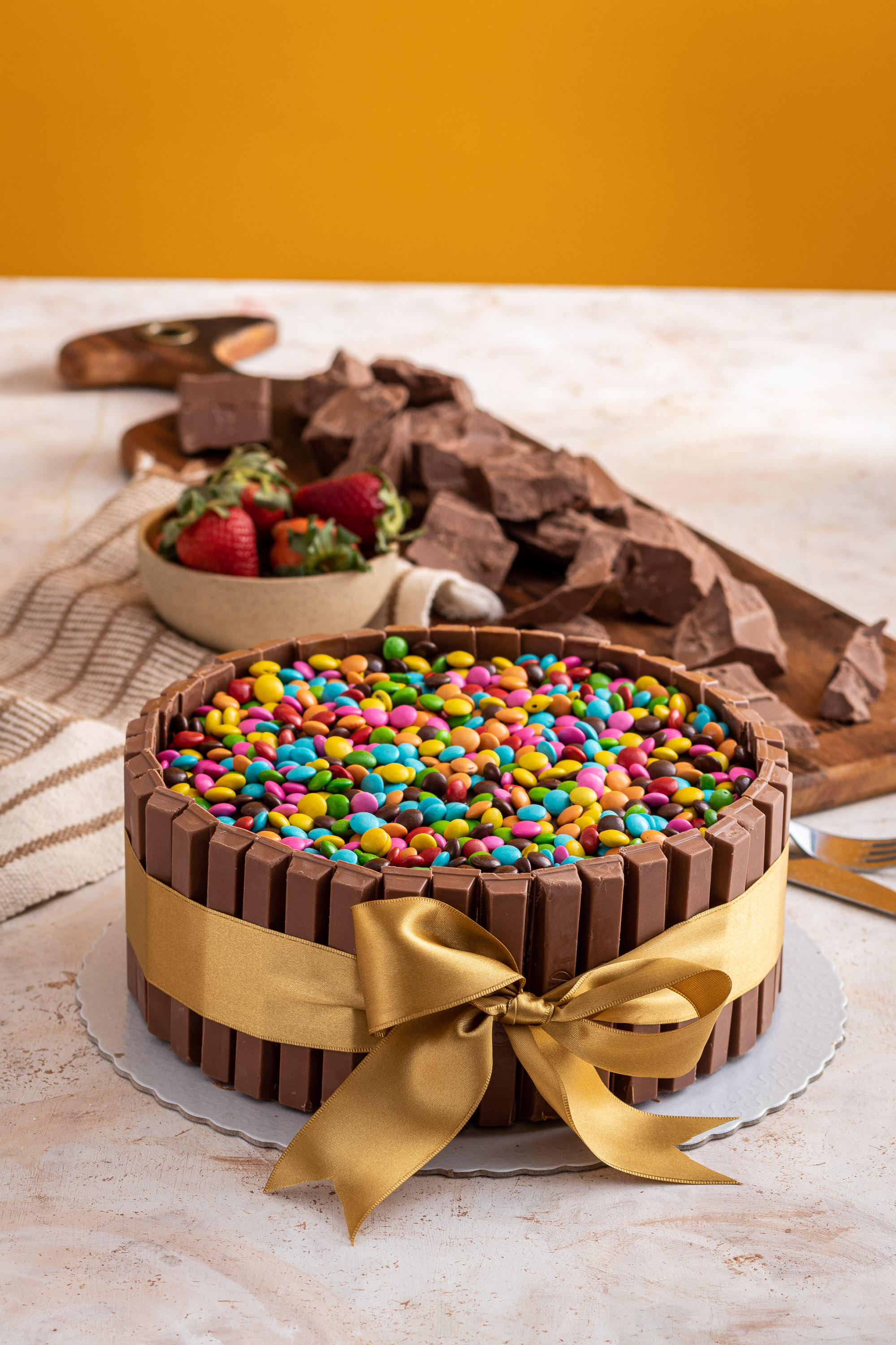 Massa de chocolate 100% cacau, creme de chocolate. kitkat, cobertura de ganache e confete