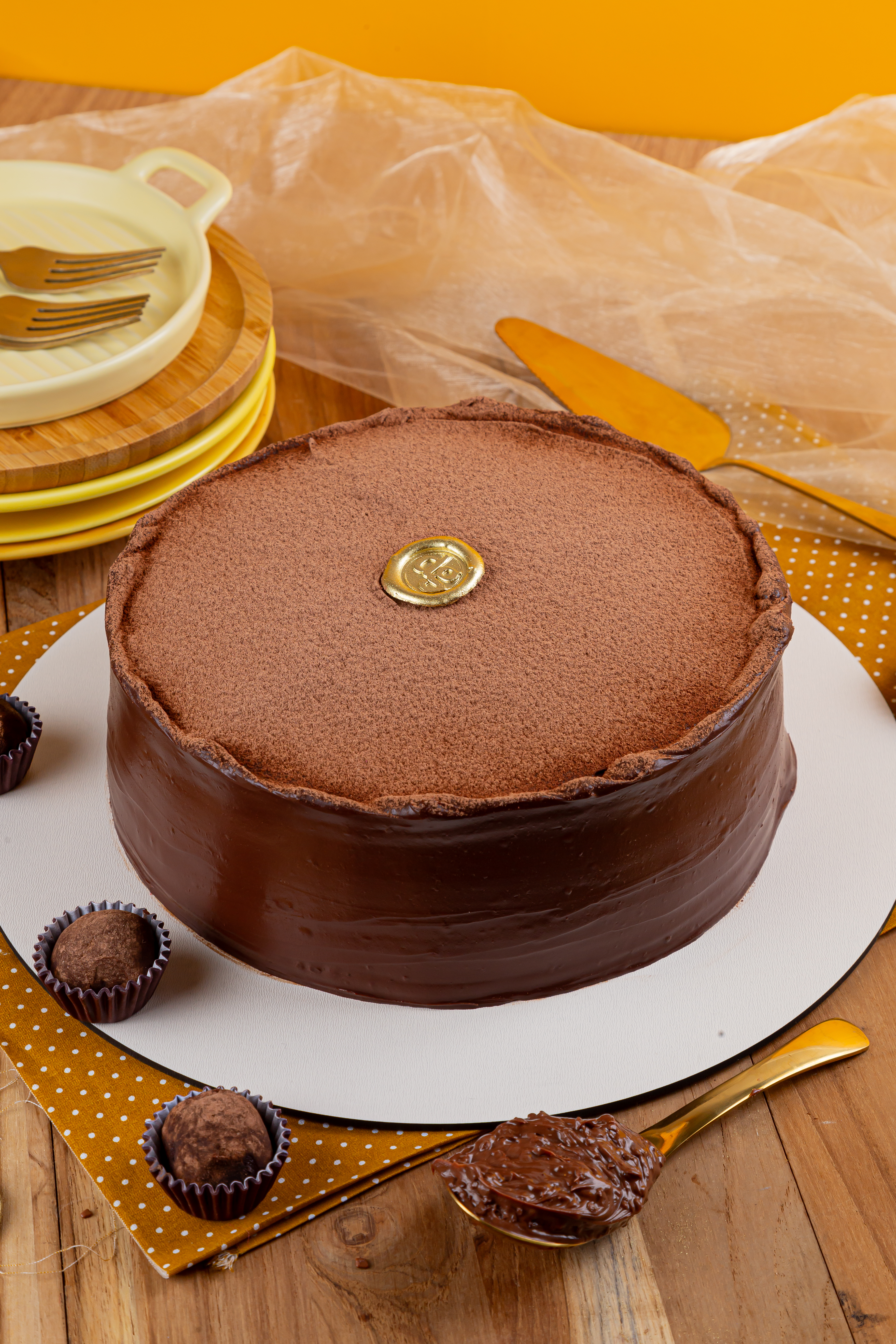 Massa de chocolate 100% cacau , creme belga, recheio de ovomaltine, ganache e chocolate em pó