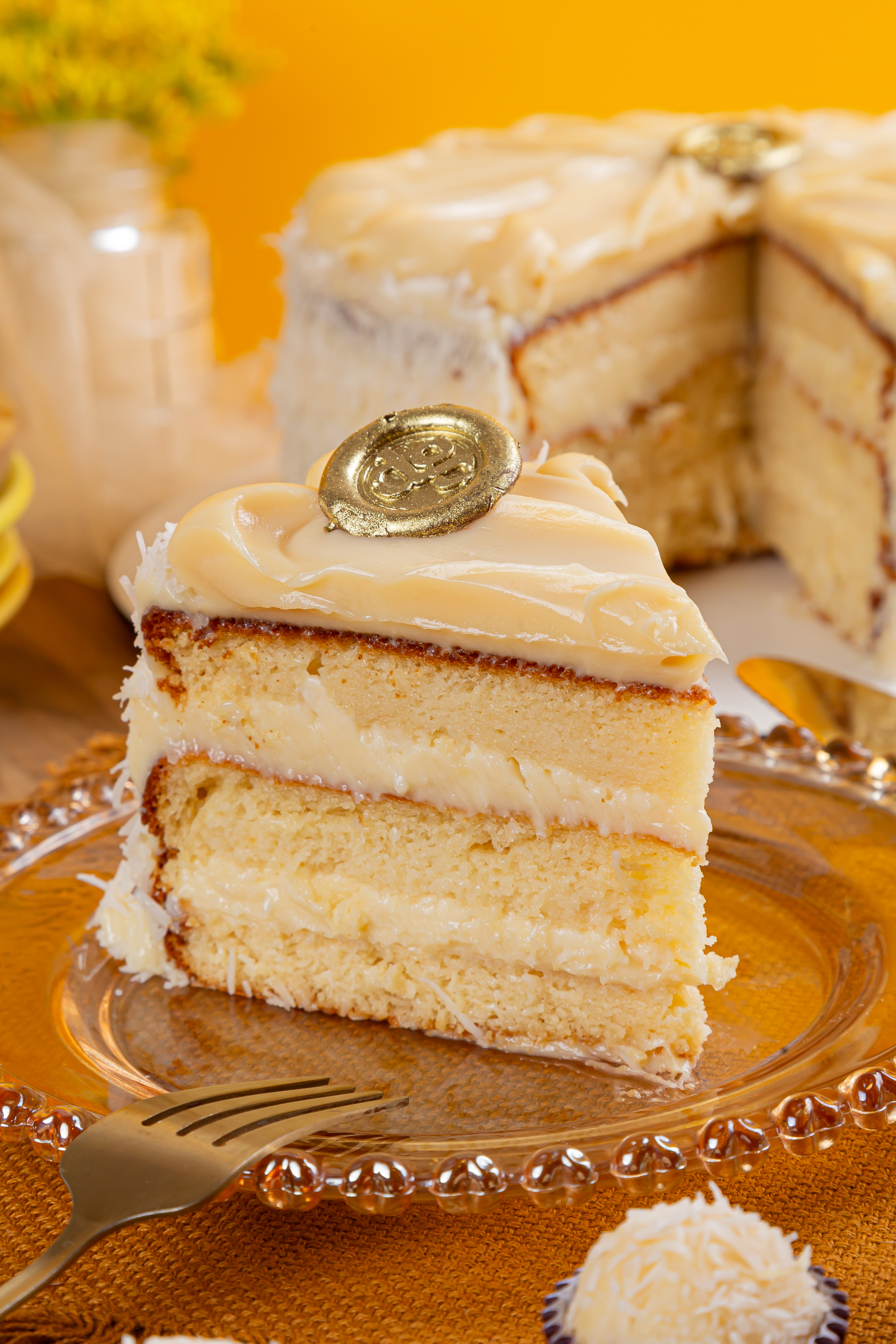 Massa de pão de ló, creme de rafaello super leve e cobertura de creme moça e coco ralado.